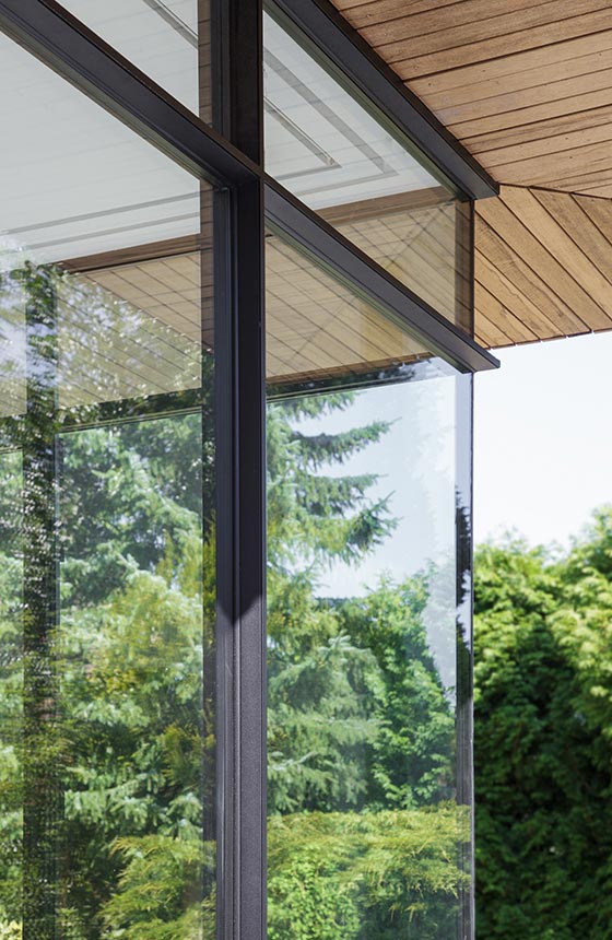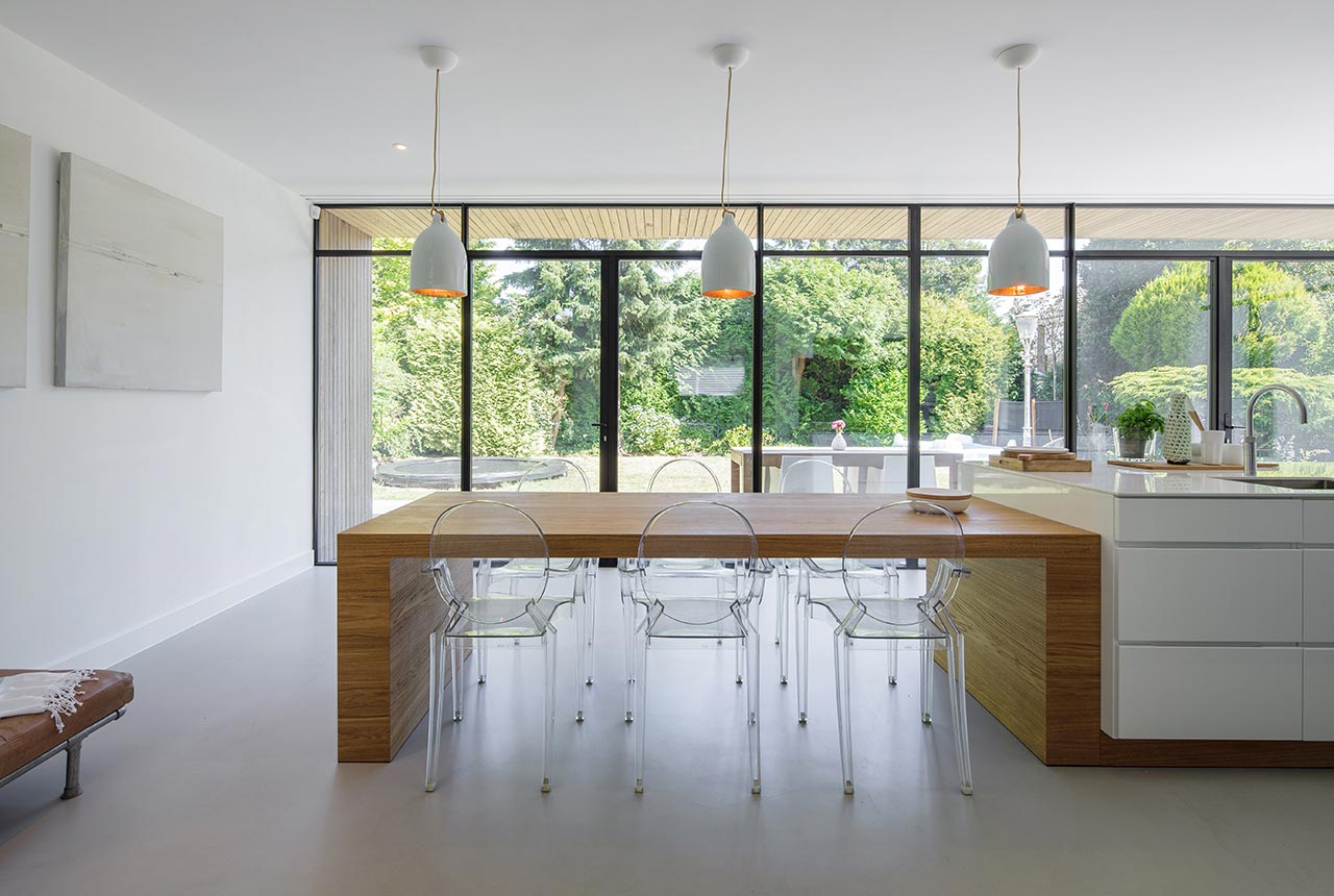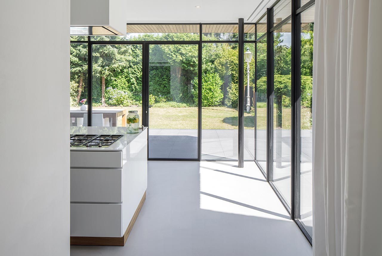 Deze aanbouw vormt enerzijds een contrast met het huis dat met riet bedekte is, maar is anderzijds naadloos versmolten met de originele woning. Van buitenaf is de eigentijds vormgegeven aanbouw duidelijk herkenbaar als toevoeging. Maar de houten latten zullen in de loop der tijd door het vergrijzen een gelijkenis gaan vertonen met het riet dat op dezelfde manier vergrijst . Van binnen vormen de keuken en de eetkamer van de uitbouw een ruimtelijke eenheid met de zitkamer en hal in de bestaande woning. De pui met zijn zwarte ranke profielen en twee dubbele deuren creëert een optimale visuele en fysieke verbinding met het terras en de tuin.